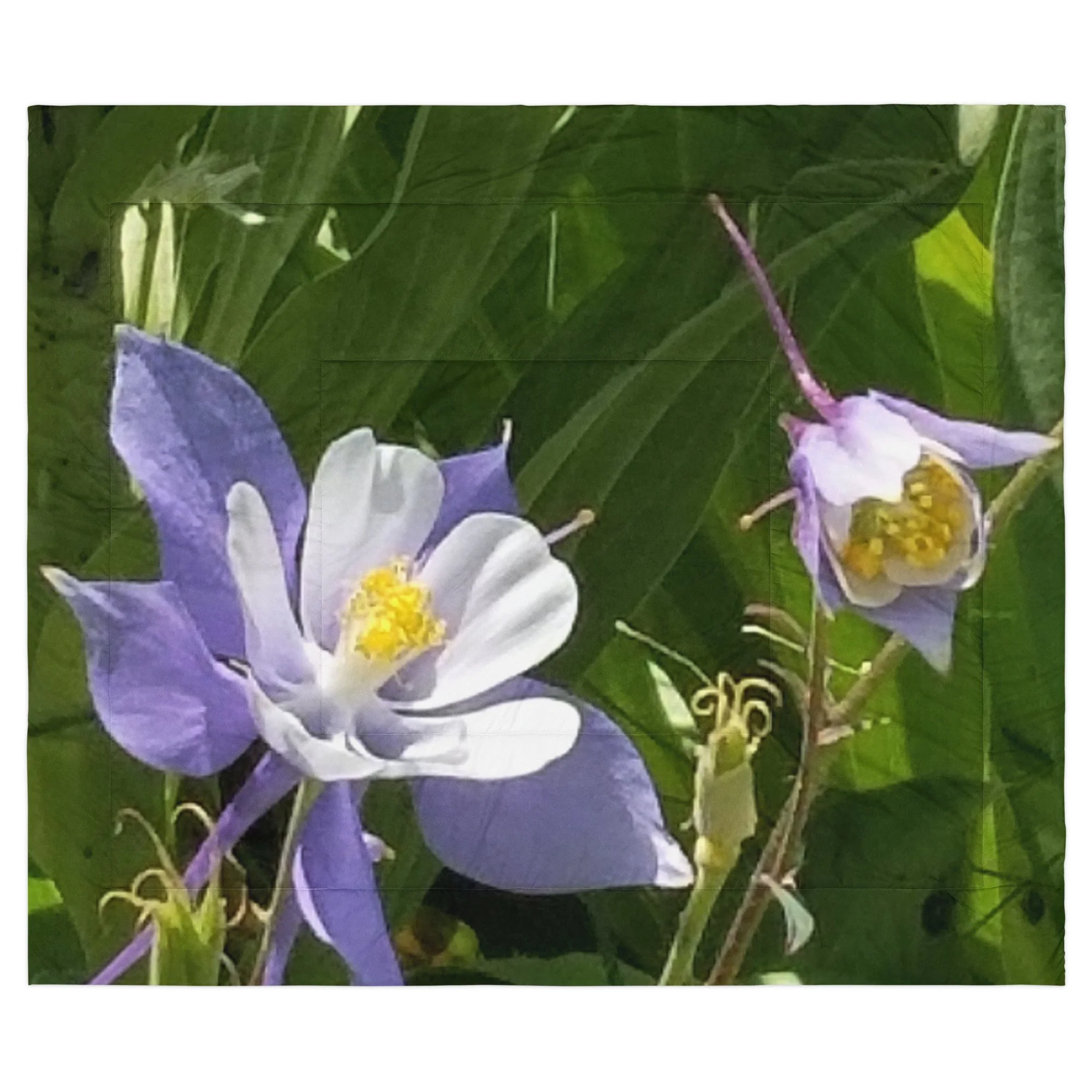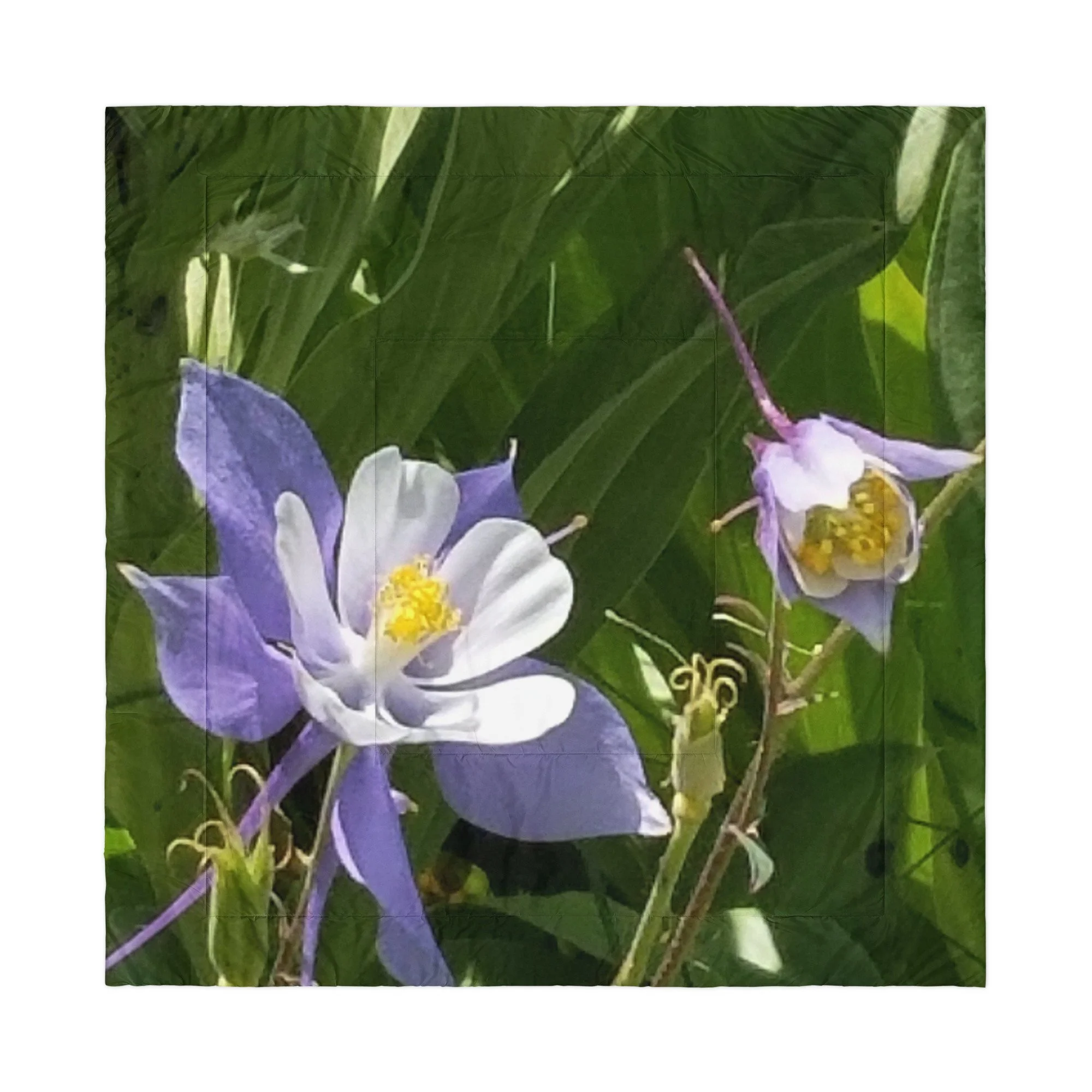 Greetings! This is an original photograph taken of Columbine flowers near the shores of Cataract Lake, in Summit County, Colorado. Rocky Mountain High! These precious flowers only bloom for a few short weeks; then they disappear into memory until summer rolls around again. Columbine (Aquilegia coerulea) is the state flower of Colorado – and it means “sky blue.” So true!
