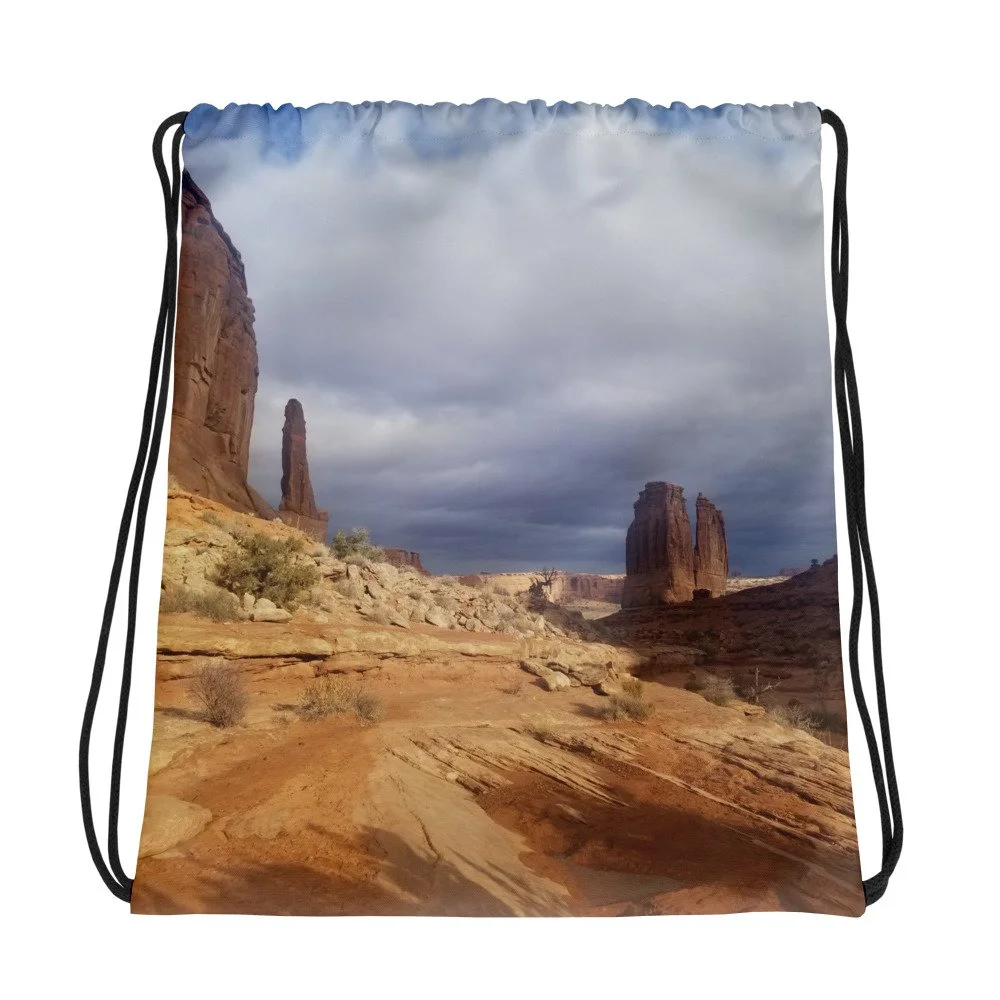 Greetings! This is an original photograph, taken in Arches National Park (near Moab, Utah, USA). The sun was barely over the horizon and shining on Park Avenue. Beautiful awakening!