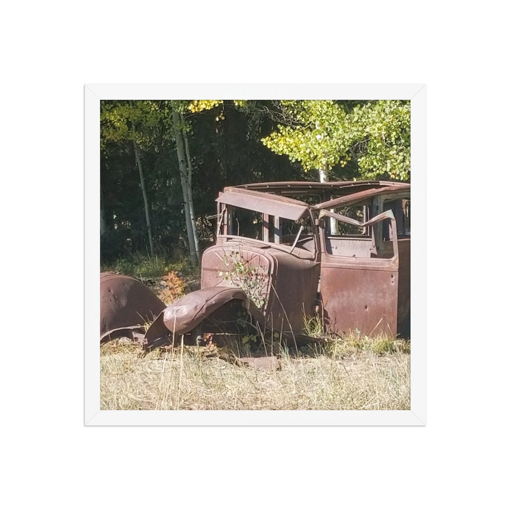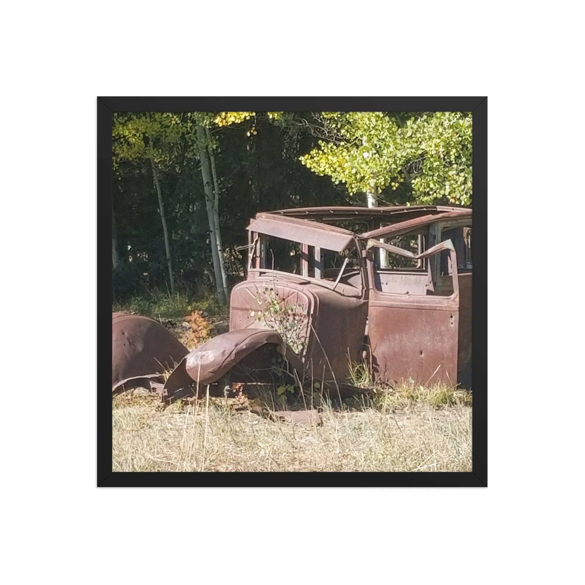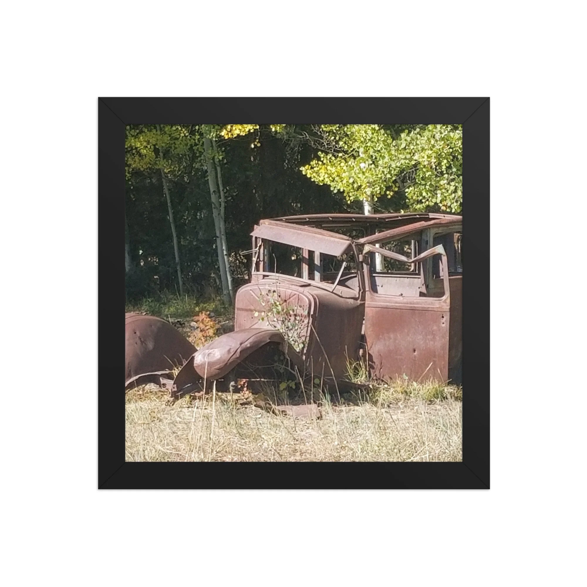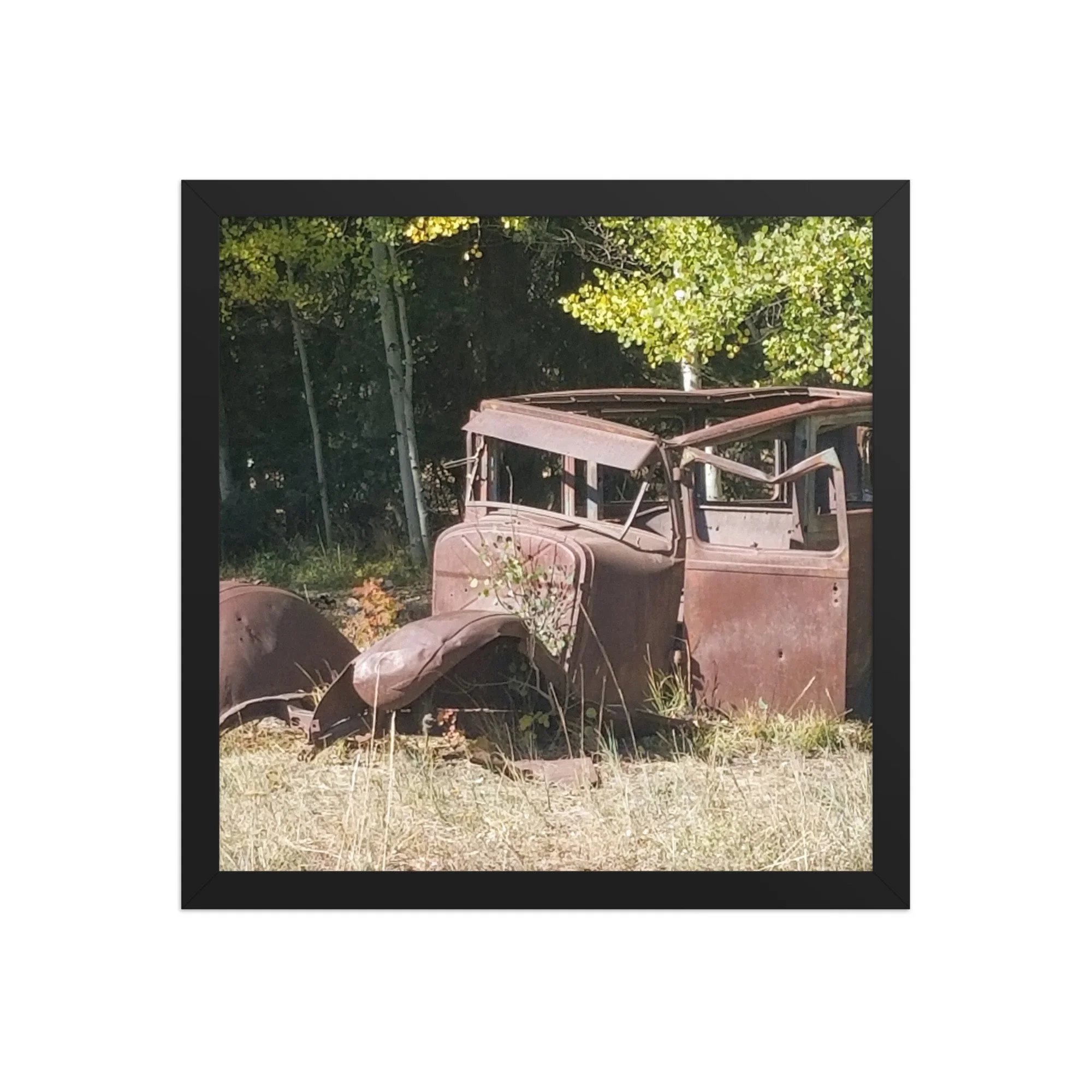 Greetings! This is an original photograph, taken along an old dirt road high in the Colorado Rockies. Doubt the road has changed since those journeying with this car went out for a picnic (or a bank robbery -- are those bullet holes?)! Always fun to reflect on the ways people used to get out and about and explore!