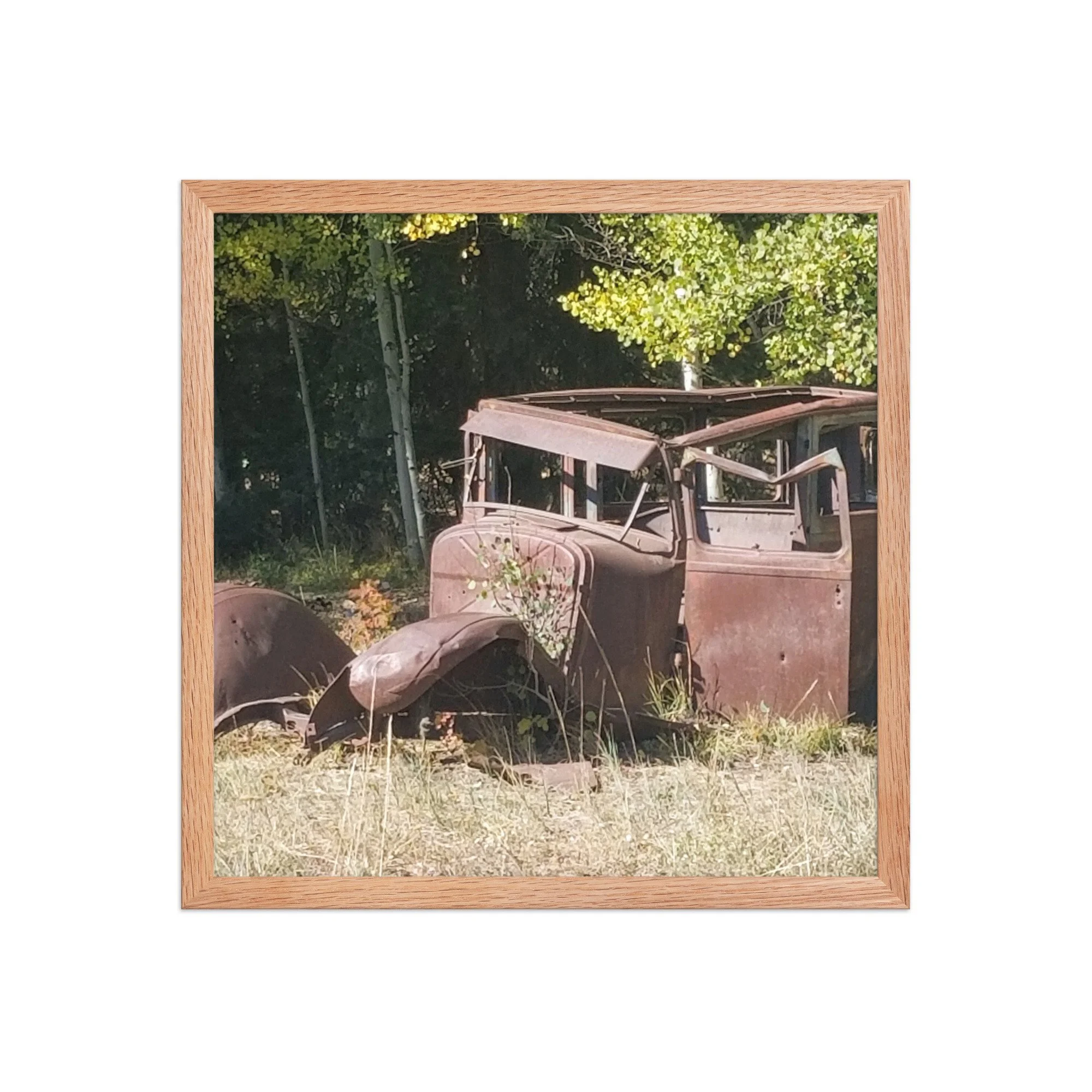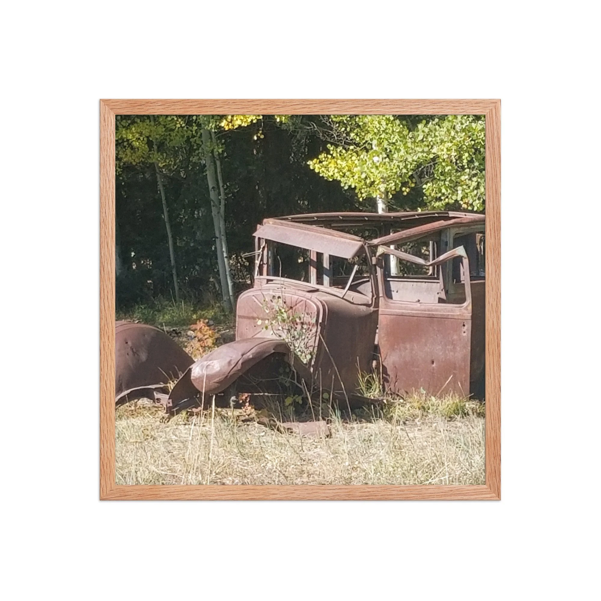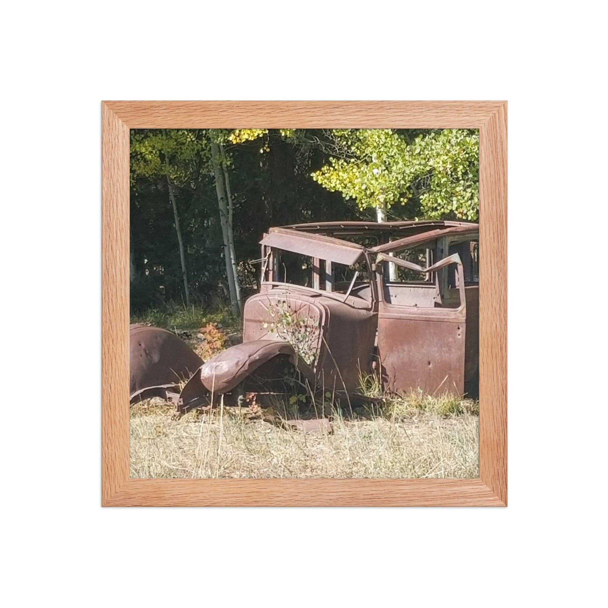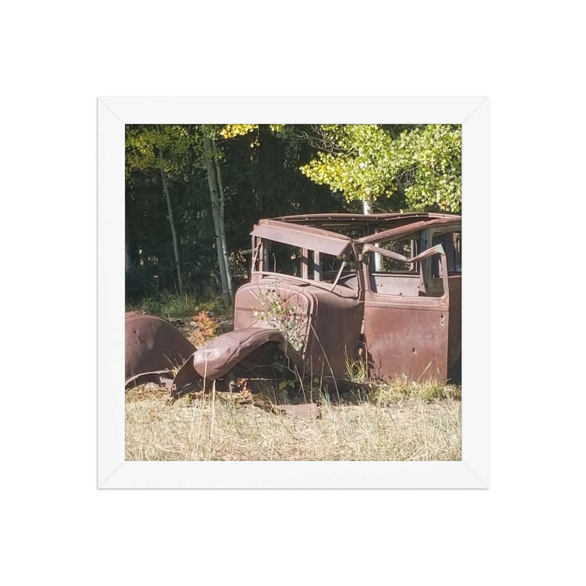 Greetings! This is an original photograph, taken along an old dirt road high in the Colorado Rockies. Doubt the road has changed since those journeying with this car went out for a picnic (or a bank robbery -- are those bullet holes?)! Always fun to reflect on the ways people used to get out and about and explore!
