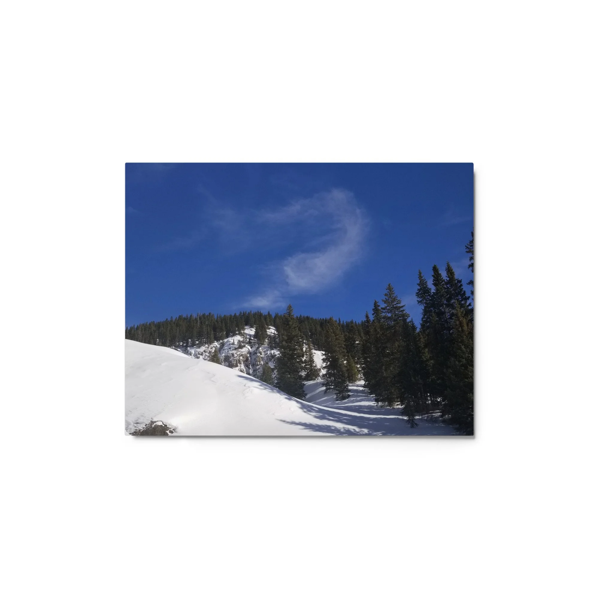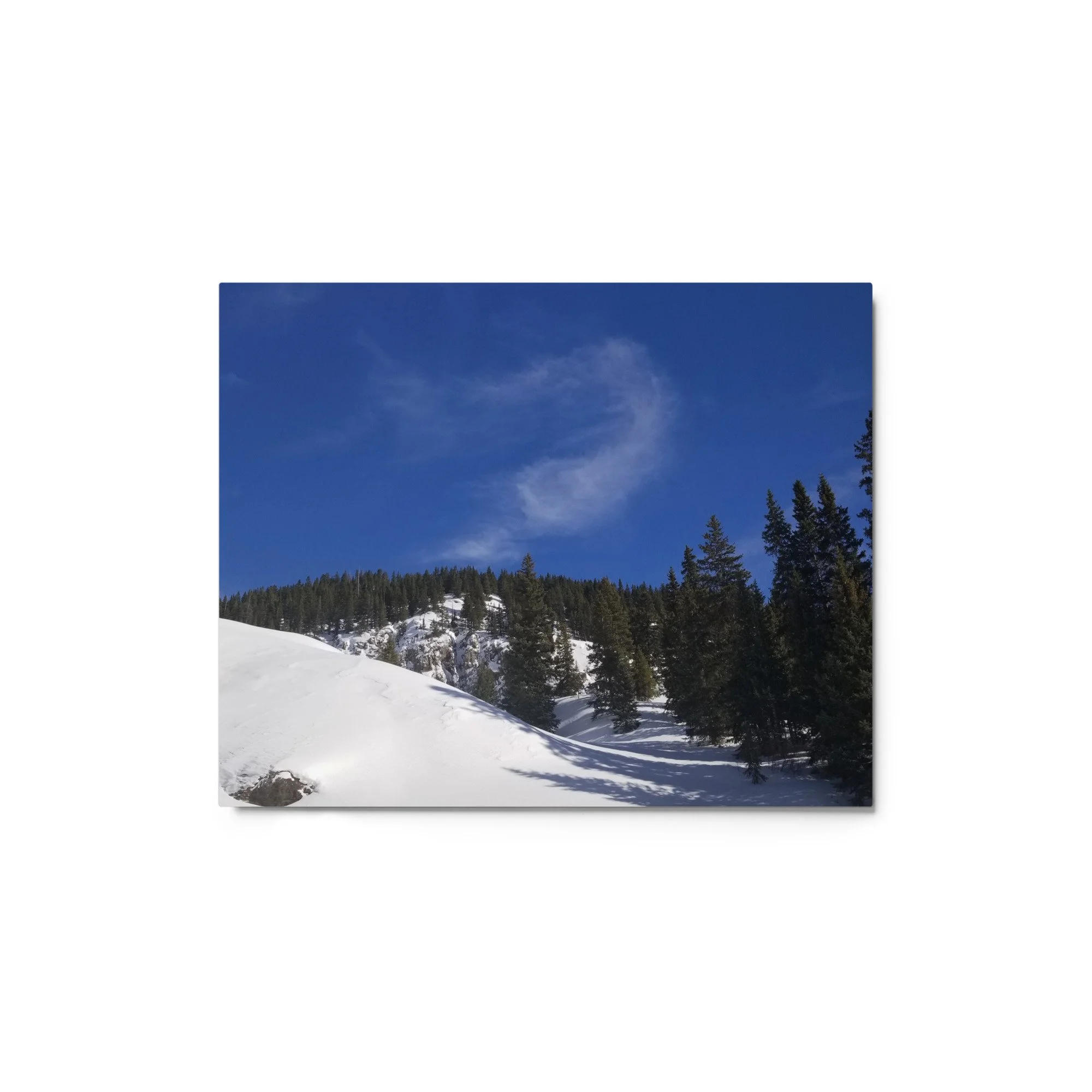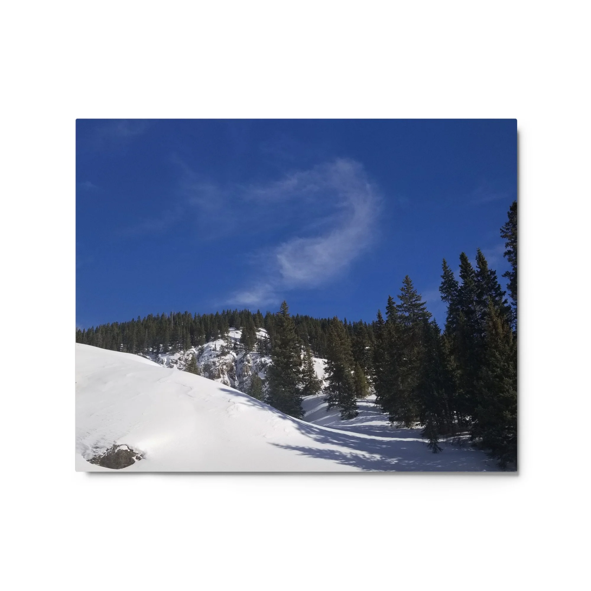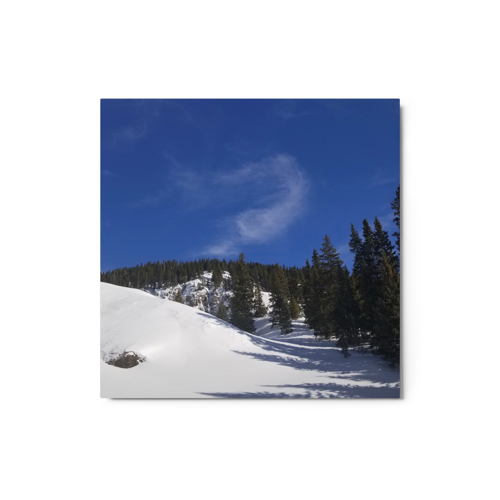 Greetings! This is an original photography, taken in the Colorado mountains. It was the morning after a fresh snow – and I couldn’t resist the “champagne powder” that Colorado is so famous for! (Not to mention to deep blue skies with dancing white clouds!) It was cold out and the sun wasn’t sure it was ready to come out, but the sparkling snow made me happy I was out!