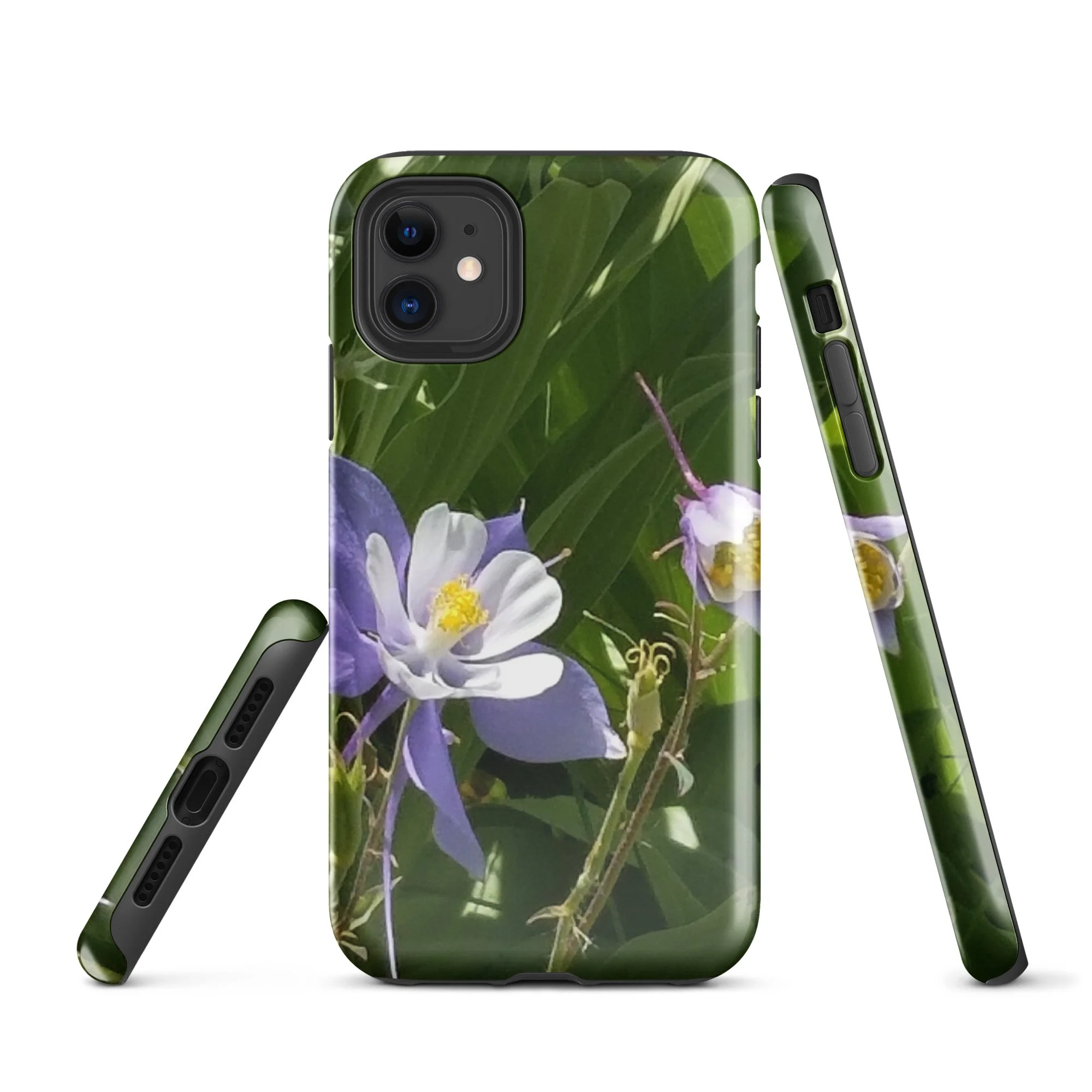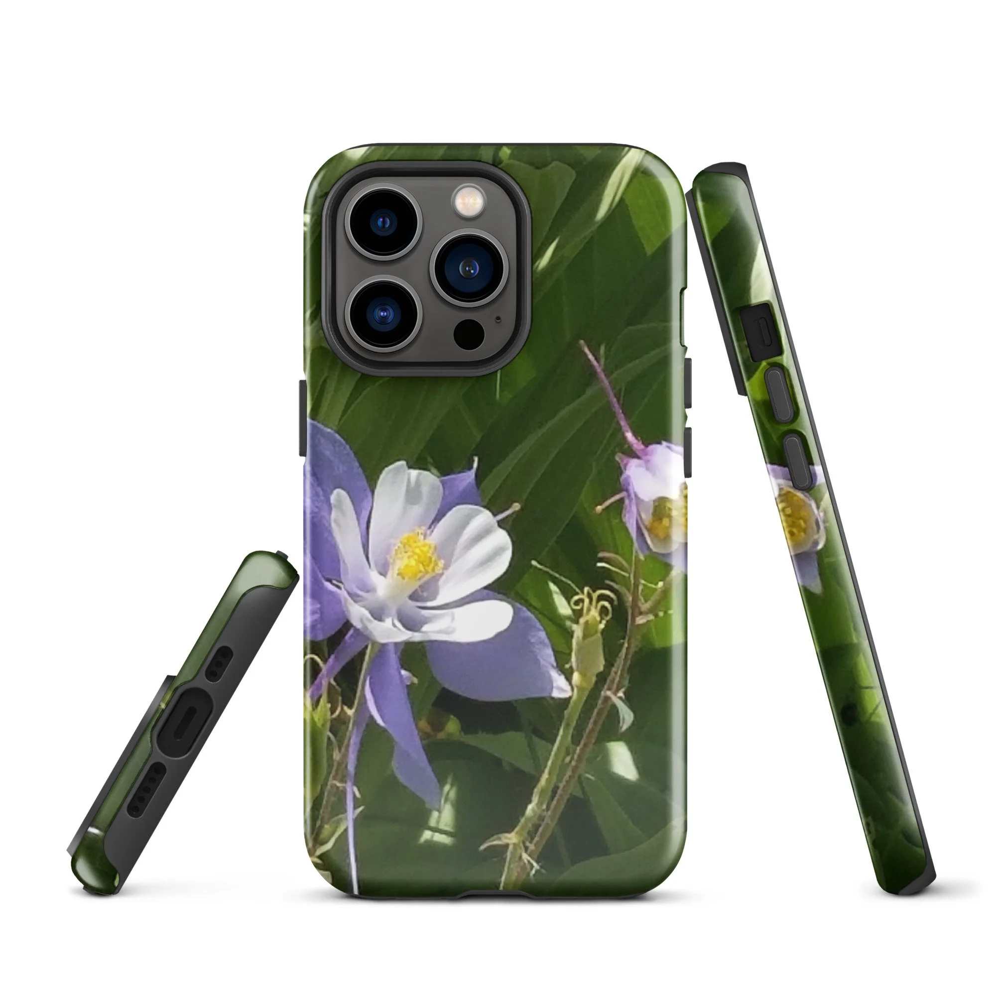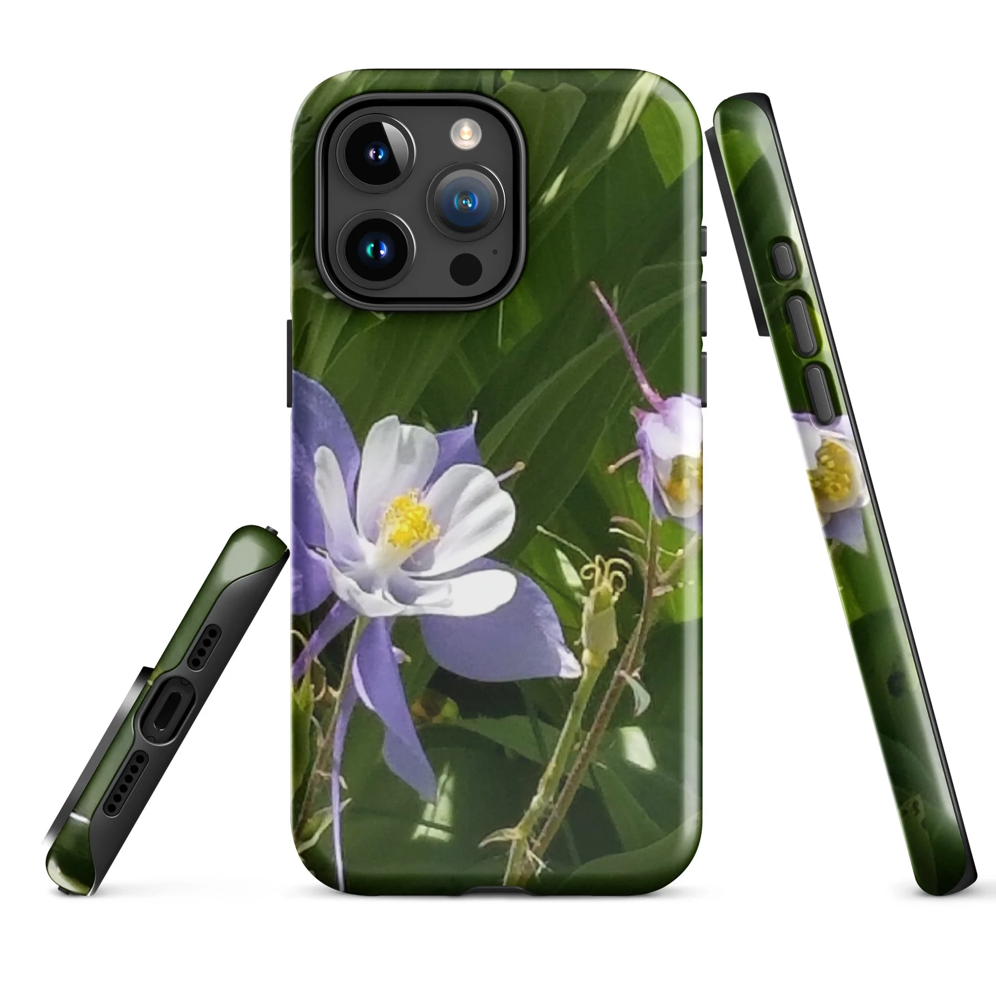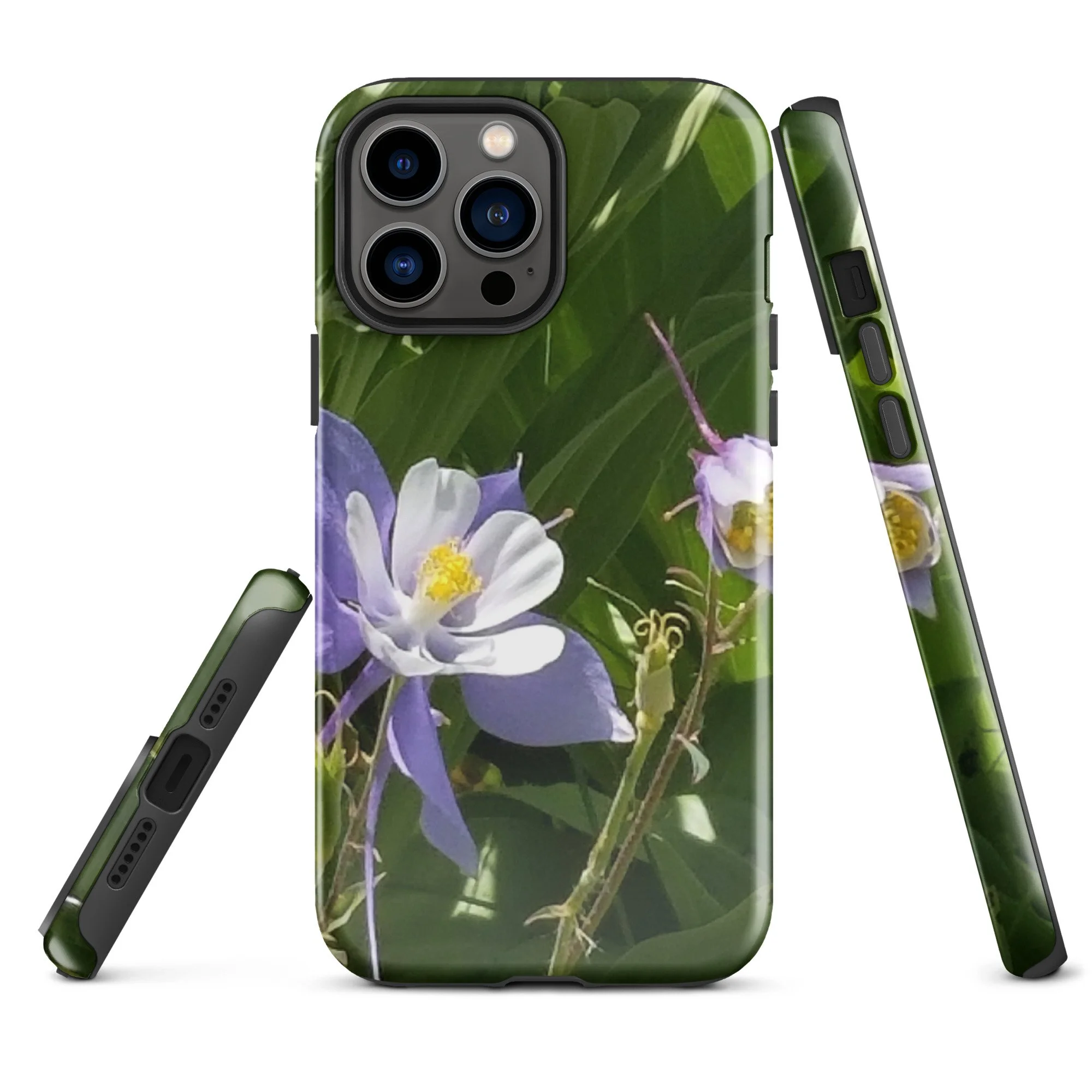 Greetings! This is an original photograph taken of Columbine flowers near the shores of Cataract Lake, in Summit County, Colorado. Rocky Mountain High! These precious flowers only bloom for a few short weeks; then they disappear into memory until summer rolls around again. Columbine (Aquilegia coerulea) is the state flower of Colorado – and it means “sky blue.” So true!