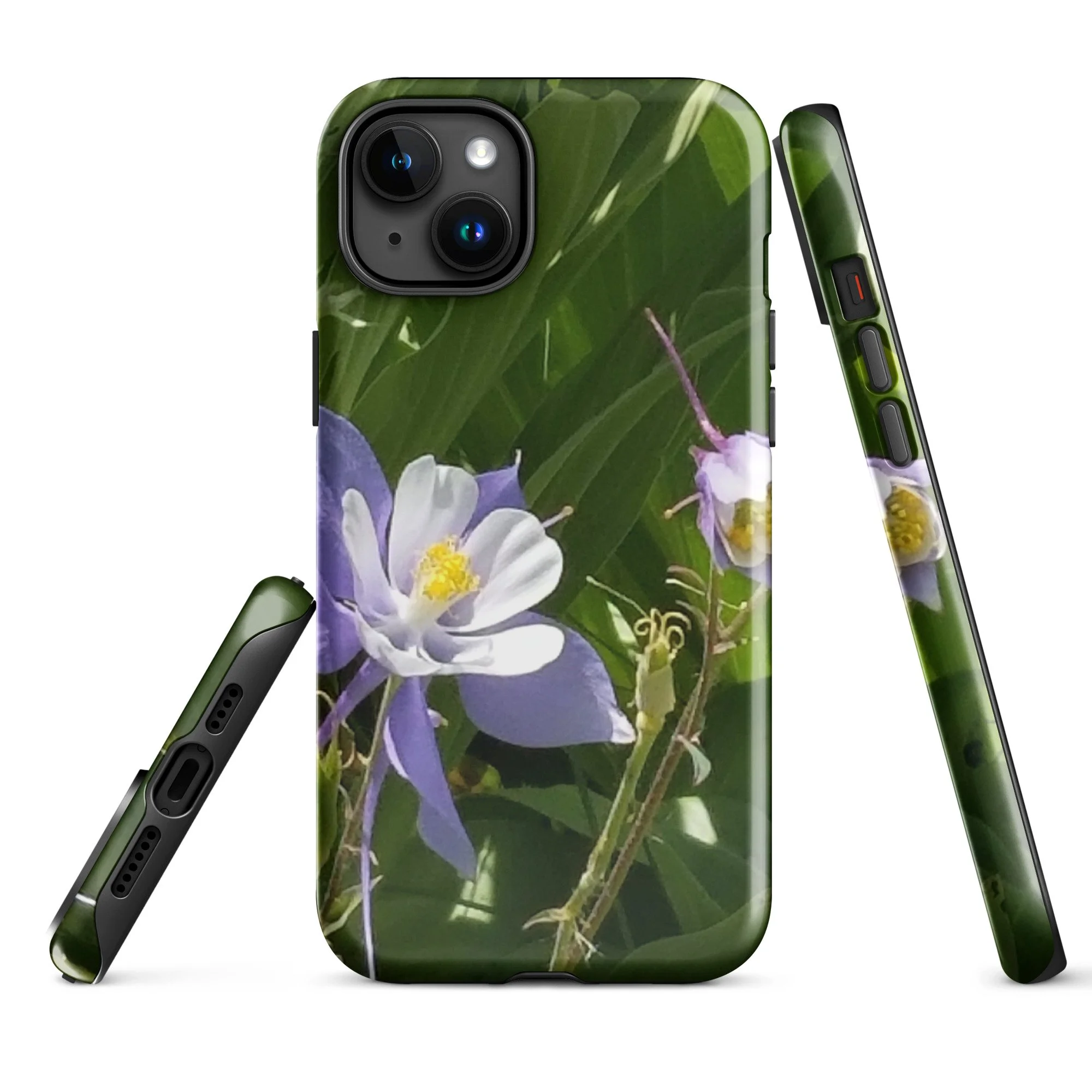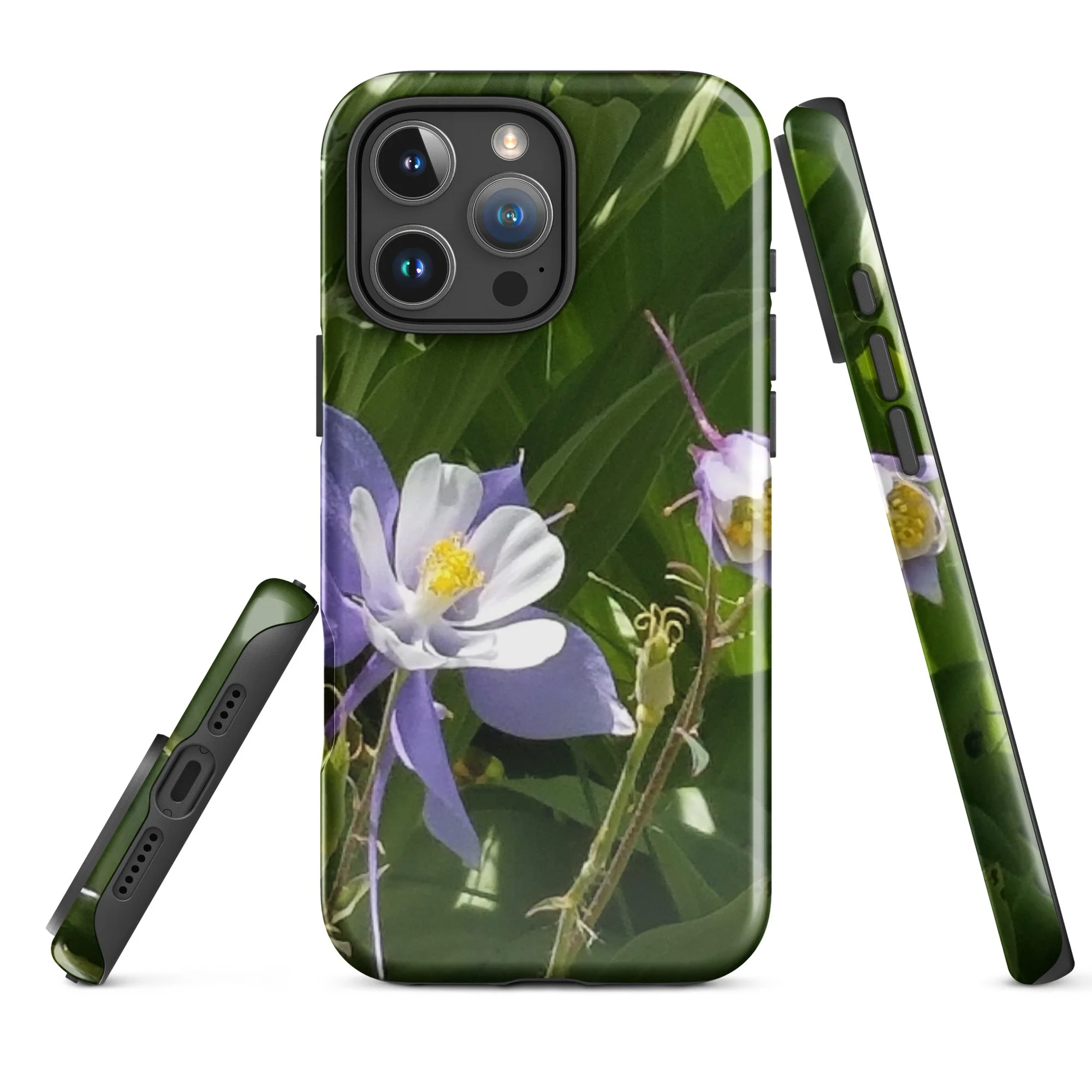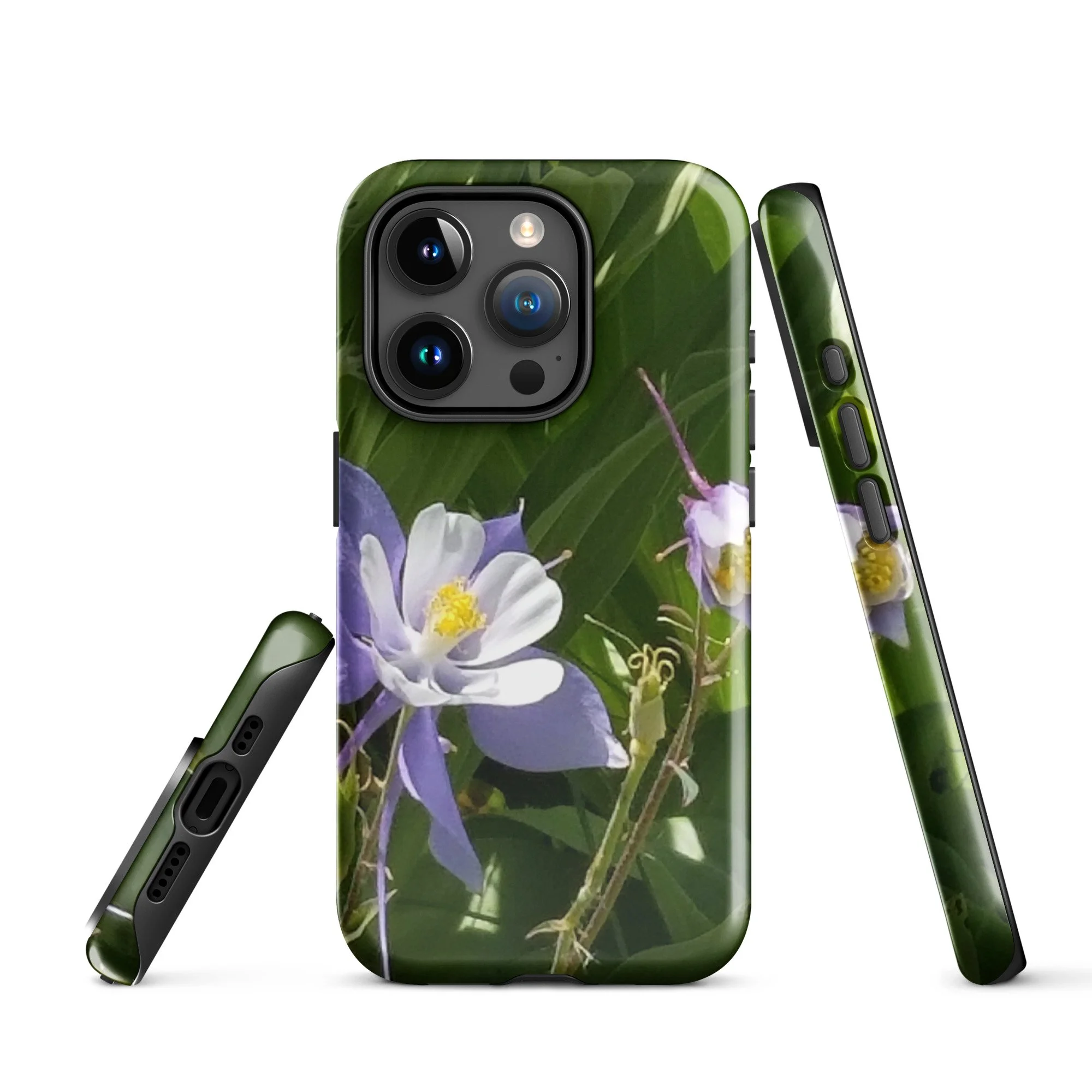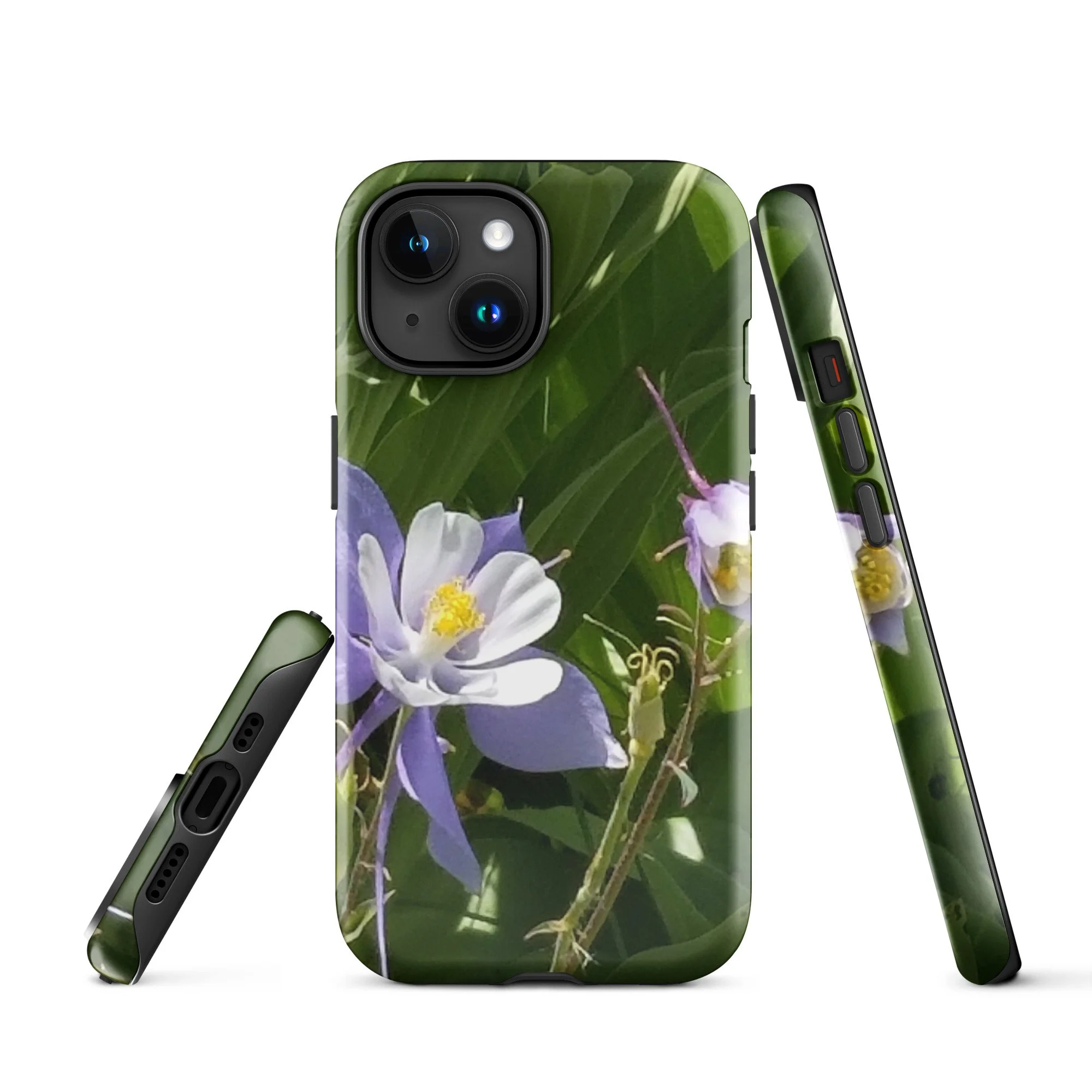 Greetings! This is an original photograph taken of Columbine flowers near the shores of Cataract Lake, in Summit County, Colorado. Rocky Mountain High! These precious flowers only bloom for a few short weeks; then they disappear into memory until summer rolls around again. Columbine (Aquilegia coerulea) is the state flower of Colorado – and it means “sky blue.” So true!